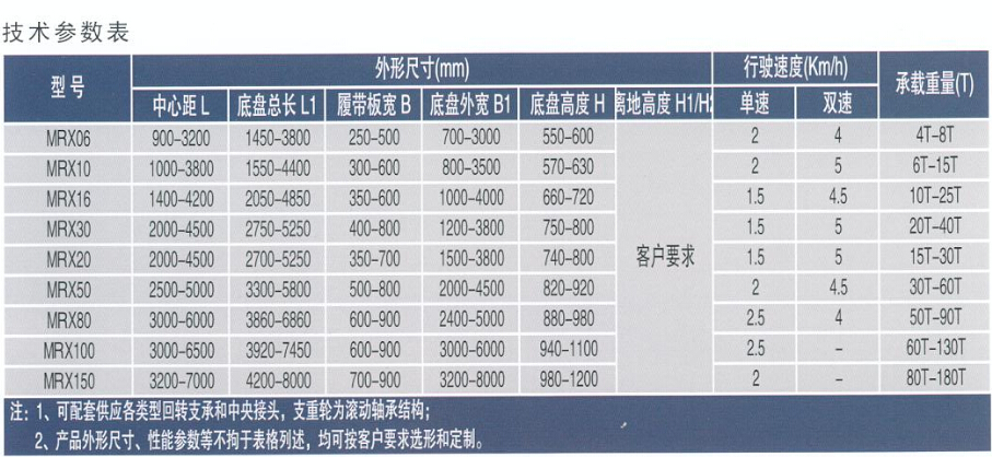 15噸帶回轉(zhuǎn)支撐的履帶的底盤性能參數(shù):承載總重:15噸,工作壓力:16MPA,行駛速度1-2公里每小時(shí),接地比壓:0.089,爬坡度數(shù):20度。制動(dòng)形式:機(jī)械制動(dòng)加液壓鎖制動(dòng)。回轉(zhuǎn)接頭:定配。