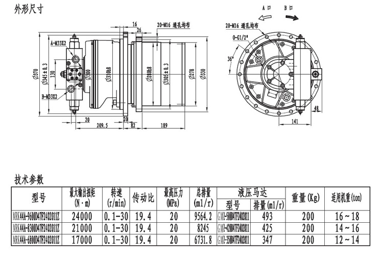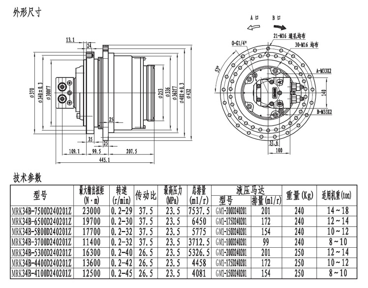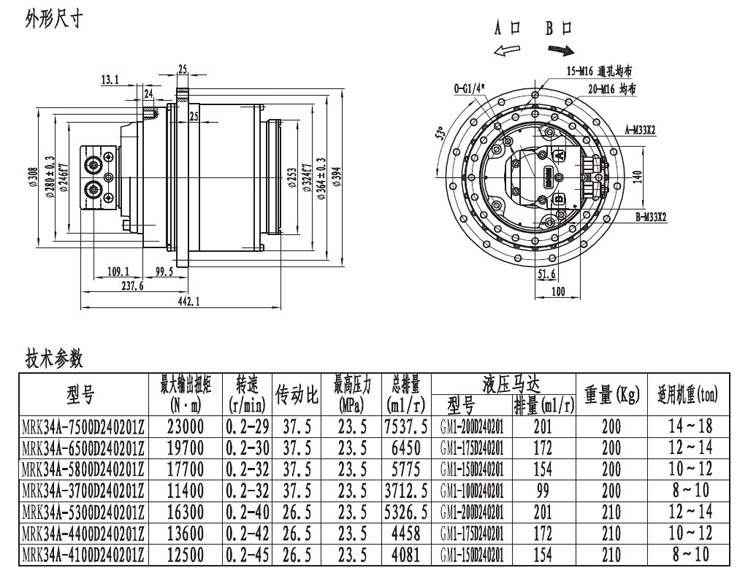 MRK34系列履帶(車輪)用的行走減速機輸出扭矩在20000NM左右,最低轉(zhuǎn)速能達到0.2轉(zhuǎn)每分,采用兩級速比行星齒輪箱傳動,外形緊湊,機械通過性極強。